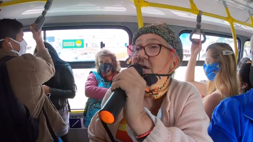 Cuando la música comienza a salir de su altavos portátil, la mujer de 69 años se convierte en una prolífica rapera cuyas rimas hacen reír a los pasajeros del Transmilenio, el sistema de autobuses públicos de Bogotá, atestado y azotado por el crimen.