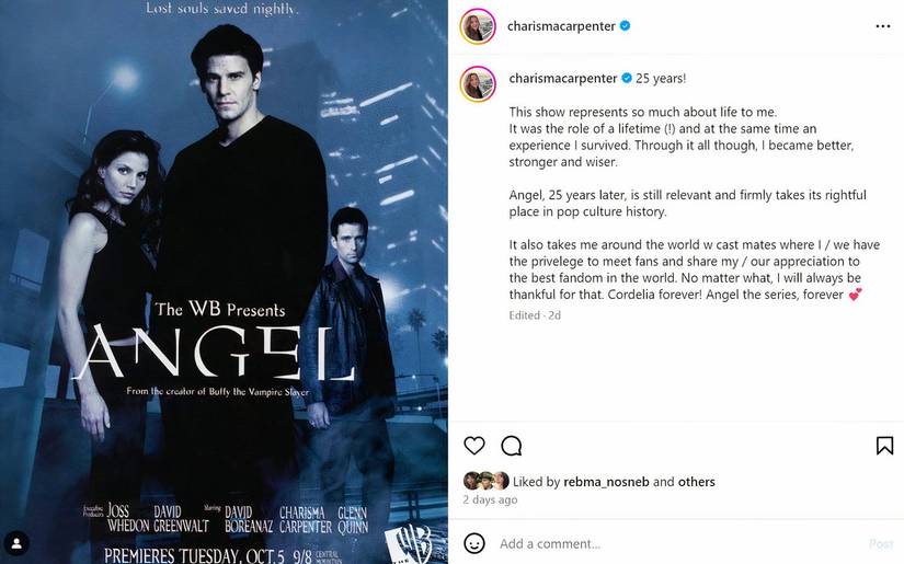 En Instagram, Boreanaz y Carpenter reflexionan sobre el programa 25 años después de su emisión. Boreanaz manifiesta su agradecimiento para la serie, diciendo que era “dado una oportunidad” y agradece a los fans por su apoyo. También incluye “Siempre conmigo #Quinny,“un homenaje al fallecido actor Quinn, a quien Boreanaz siempre ha llamado un amigo cercano. Carpenter comparte su agradecimiento por “el papel de su vida”, al tiempo que hace referencia a que filmar la serie fue una experiencia a la que sobrevivió, en parte refiriéndose al presunto abuso por parte de Whedon.