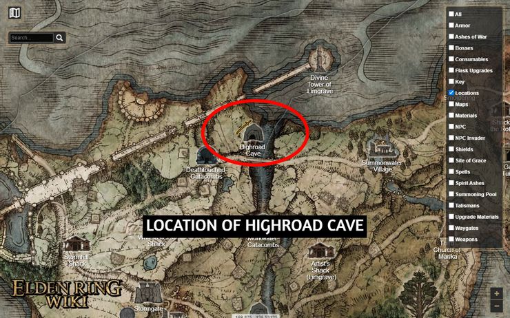 Ubicación de Highroad Cave en Elden Ring