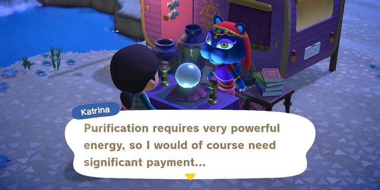 Una mala fortuna de Katrina en Cruce de animales: nuevos horizontes maldice todo el día con una suerte desastrosa, pero puede purificar una mala fortuna por 10.000 campanas, lo cual es bastante caro. Al igual que en juegos de series anteriores, Katrina tiene el don de la clarividencia, capaz de ver el futuro y predecir el destino del jugador. Los resultados de sus visiones afectan muchos detalles, como las interacciones de los aldeanos y las caídas de elementos, lo que dificulta la mala suerte. Aunque un día de suerte disminuida ciertamente tiene sus inconvenientes, vale la pena sopesar si la purificación de Katrina en ACNH vale la pena su elevado precio.