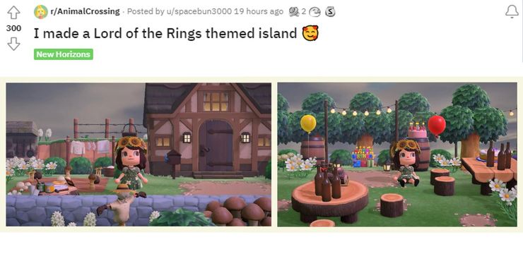 un jugador de Cruce de animales: nuevos horizontes está dando a su isla un señor de los Anillos-cambio de imagen inspirado con recreaciones de ubicaciones de Hobbiton y más. Diseños de películas en Cruce de animales son populares, y los usuarios utilizan la variedad de elementos y herramientas de diseño del juego de Nintendo para recrear sus escenarios, escenas y personajes favoritos de programas de televisión y películas.