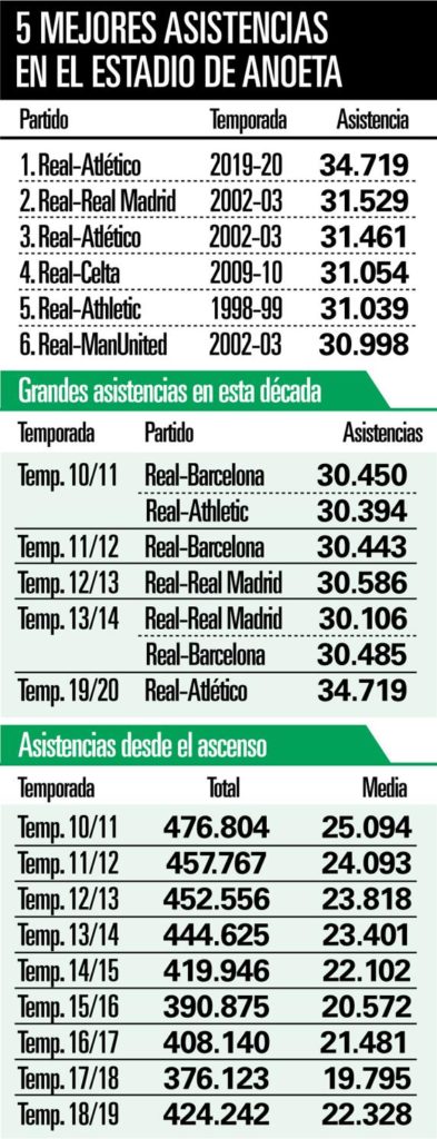 Los 34.719 espectadores que registró el estadio representaron, sin duda, la mejor entrada de la historia, muy superior a la anterior, la registrada en 2003 contra el Real Madrid (31.529). La tercera, curiosamente en otro encuentro ante el Atlético de ese mismo año 2003, todavía se queda más lejos (31.461). No obstante, en estos dos partidos de la temporada en la que la Real a punto estuvo de ser txapeldun el porcentaje de ocupación fue más elevado que el del sábado: 98,28% y 98,08% contra el 89,02% de hace dos días.