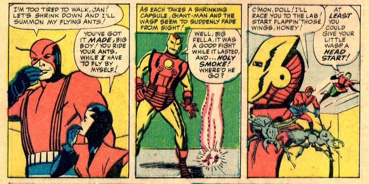 En Vengadores #5 por Stan Lee y Jack Kirby, los Vengadores están reunidos en una de las propiedades de Tony Stark que sirvió como base de operaciones para el equipo luego de un alboroto reciente de Hulk. Los Vengadores discuten sobre Hulk y cómo pueden traerlo de regreso bajo su supervisión, ya que creen que es demasiado peligroso para dejarlo sin control. Cuando termina la reunión, Ant-Man mira a su esposa Wasp, también conocida como Janet Van Dyne, y dice: “¡Estoy demasiado cansada para caminar, Jan! ¡Vamos a encogernos y convocaré a mis hormigas voladoras!”.