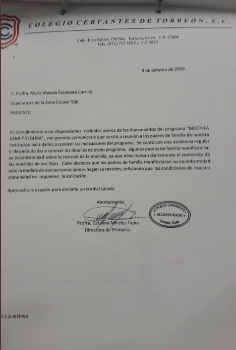 En un comunicado fechado el 4 de octubre de 2019 firmado por Catalina Mireles Tapia, directora del plantel notificó a la supervisora de la Zona Escolar 506 la negativa de los padres de familia para la implementación del operativo “Mochila sana y segura”.