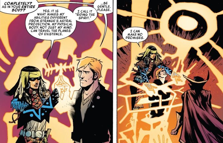 Para encontrar el meollo de los problemas de Johnny, Kushala debe entrar en su espíritu. Normalmente, algo como esto requeriría que un hechicero usara el Plano Astral y el proyecto astral ellos mismos. Esto luego divide al hechicero en dos mitades y requiere una concentración extrema de la mente. El mundo exterior también puede afectar el alma en función de estímulos externos (como se ve en la película de MCU, Doctor Extraño). Hasta cierto punto, estos factores no afectan a Kushala. Ella no tiene que usar la proyección astral para abordar el problema de Johnny: este Hechicero Supremo puede mover toda su forma física hacia él, no solo su alma.