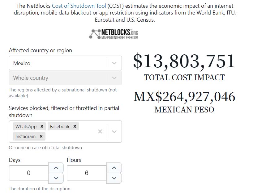 El apagón de seis horas que afectó este lunes a nivel mundial a los servicios de la compañía Facebook y a las plataformas de WhatsApp, Instagram y Messenger durante un lapso de seis horas aproximadamente le costó a México 265 millones de pesos, de acuerdo con la estimación de la empresa de ciberseguridad NetBlocks. Además, tuvo impacto en 80 millones de usuarios.