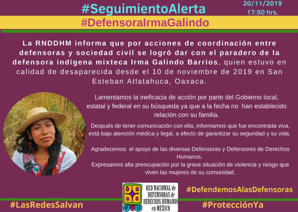 Gloria Flores, coordinadora de la Red Nacional de Defensoras de Derechos Humanos en México, detalló que la aparición de Irma Galindo fue gracias a la colaboración de defensoras de la red y de organizaciones de la sociedad civil.