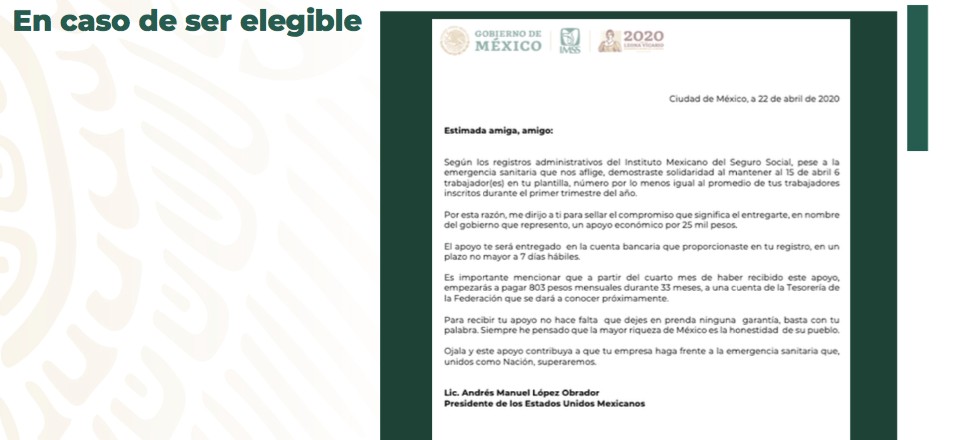 En cada una de las cartas con las que el gobierno otorgará créditos de 25 mil pesos a las pequeñas empresas que requieran ayuda por la contingencia de Covid-19, aparecerá el nombre del presidente Andrés Manuel López Obrador, según se pudo ver en una de las misivas que difundió la propia Presidencia de la República, en un documento que se puede consultar al final de esta nota.