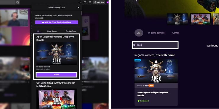 El “Apex Legends: Valkyrie Deep Dive Bundle” debería aparecer en las primeras ranuras de la ventana Prime Loot. Haga clic en el botón “Reclamar” a continuación para adquirir los bienes digitales. Supongamos que el paquete no aparece para jugadores específicos. En este caso, elija el botón en la parte superior de la ventana titulado “Visita la página de botín de Prime Gaming”. Seleccione la barra de búsqueda e ingrese “apex”. Debería aparecer el Deep Dive Bundle, y los jugadores podrán reclamarlo fácilmente desde esta pantalla.