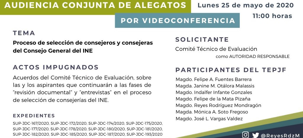 El magistrado Reyes Rodríguez Mondragón informó del asunto en su cuenta de Twitter y también anunció, por la misma vía, que el próximo lunes serán escuchados por los magistrados, en videoaudiencia, los integrantes del Consejo Técnico de Evaluación, que está en el centro de las demandas como autoridad responsable de excluir del proceso a los inconformes.
