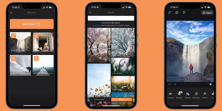 Una vez que haya pasado todo eso, es hora de usar Motionleap para animar sus fotos. Para comenzar, toque el ícono de fotos en la esquina superior izquierda (el que parece dos fotos apiladas una encima de la otra). Permita que Motionleap acceda a sus fotos si solicita permiso, toque “Nuevo proyecto” y luego seleccione la foto a la que desea agregar movimiento. Motionleap muestra sus propias fotos de forma predeterminada, pero también puede tocar el botón ‘Stock’ en la parte inferior de la pantalla para ver imágenes libres de regalías de Unsplash.