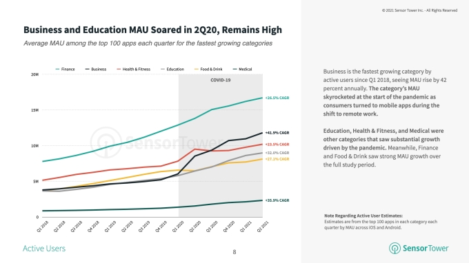 Las aplicaciones comerciales experimentaron la tasa de crecimiento anual compuesta (CAGR) más alta entre el primer trimestre de 2018 y el segundo trimestre de 2021, subiendo casi un 42% durante ese período, dijo Sensor Tower. Mientras tanto, los consumidores en el segundo trimestre de 2021 pasaron la mayor parte del tiempo en aplicaciones de entretenimiento, y cada uno de los 100 principales tuvo casi 29 minutos de uso diario, en promedio.