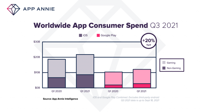 La firma dijo que el mayor contribuyente a los ingresos de las aplicaciones en el tercer trimestre sigue siendo el gasto en el juego y las suscripciones móviles; este último, un foco de demandas y una mayor regulación, ya que tanto Apple como Google luchan por retener su derecho a una parte de las compras que fluyen. a través de sus plataformas de tienda de aplicaciones. Los juegos continúan representando la mayor parte del gasto de los consumidores, aunque el gasto no relacionado con los juegos ha aumentado su participación en los últimos años, gracias a las suscripciones.