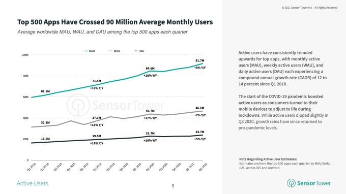 Un informe de un competidor de App Annie, Sensor Tower, también publicado hoy, se sumerge en usuarios activos, sesiones y métricas de retención para juegos y no juegos por igual. La firma descubrió que las 500 aplicaciones principales en todo el mundo ahora tienen un promedio de 91,7 millones de usuarios activos mensuales y este número ha crecido un 8,4% año tras año durante el segundo trimestre, frente a los 84,6 millones del segundo trimestre de 2020.