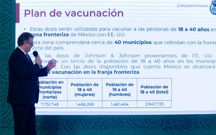 “También se tomó la decisión que esas vacunas, y se está haciendo el trámite para ampliarlas, ya sea que se reciban de parte del gobierno de Estados Unidos o que se adquieran a la farmacéutica, se van a utilizar para un plan de vacunación especial en los municipios fronterizos de nuestro país en la frontera norte con el propósito de que se puedan ya regularizar ya las comunicaciones en la frontera, que se abra la frontera norte lo más pronto posible”, dijo.