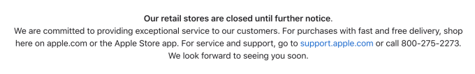 A principios de esta semana, en un comunicado de prensa, el fabricante de iPhone dijo que cerraría las tiendas minoristas fuera de China hasta el 27 de marzo. Una nota en su sitio web ahora dice que el cierre está abierto. Apple escribe que las tiendas físicas “están cerradas hasta nuevo aviso”, por lo que al menos les está indicando a los clientes que esperen interrupciones continuas en su negocio minorista como de costumbre.