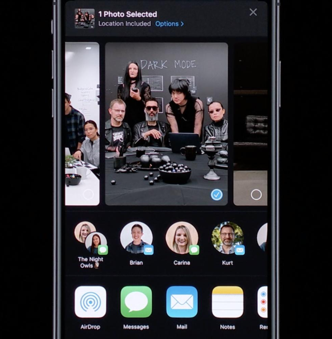 Recomendaciones de mensaje de foto – Cuando abre la Hoja de Compartir para una foto o video en iOS 13, Apple recomendará a las personas que lo envíen a través de iMessage o Mail en función de con quién compartes con frecuencia y si aparecen amigos en el contenido. Con unos pocos toques, puede enviar sus imágenes de manera privada a una gran cantidad de amigos cercanos y chats de grupo favoritos, lo que podría eliminar la necesidad de publicarlo más ampliamente en Facebook o Instagram.
