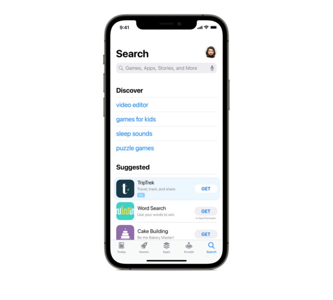 Esta nueva y más destacada ubicación de anuncios se encuentra en la pestaña de búsqueda de la App Store, que recibe millones de visitas de propietarios de dispositivos Apple cada mes. Hoy, la pestaña Buscar ofrece dos secciones debajo del cuadro de búsqueda: una sección “Descubrir” que destaca las tendencias actuales de la App Store y una sección “Sugeridos” con aplicaciones y juegos recomendados para probar. El anuncio aparecerá en la última sección en la parte superior de la lista de aplicaciones sugeridas.