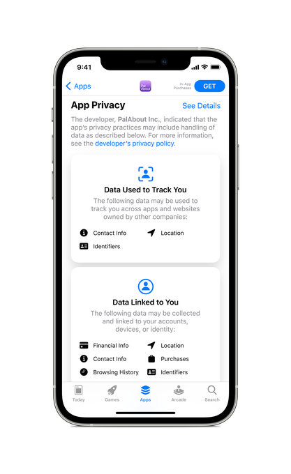 Las nuevas etiquetas tienen como objetivo brindar a los clientes de Apple una forma más fácil de comprender qué tipo de información recopila una aplicación en tres categorías: datos utilizados para rastrearlo, datos vinculados a usted y datos no vinculados a usted. El seguimiento, explica Apple, se refiere al acto de vincular los datos del usuario o del dispositivo recopilados de una aplicación con los datos del usuario o del dispositivo recopilados de otras aplicaciones, sitios web o incluso propiedades fuera de línea (como datos agregados de recibos minoristas) que se utilizan para publicidad o publicidad dirigida. medición. También puede incluir compartir datos de usuarios o dispositivos con corredores de datos.