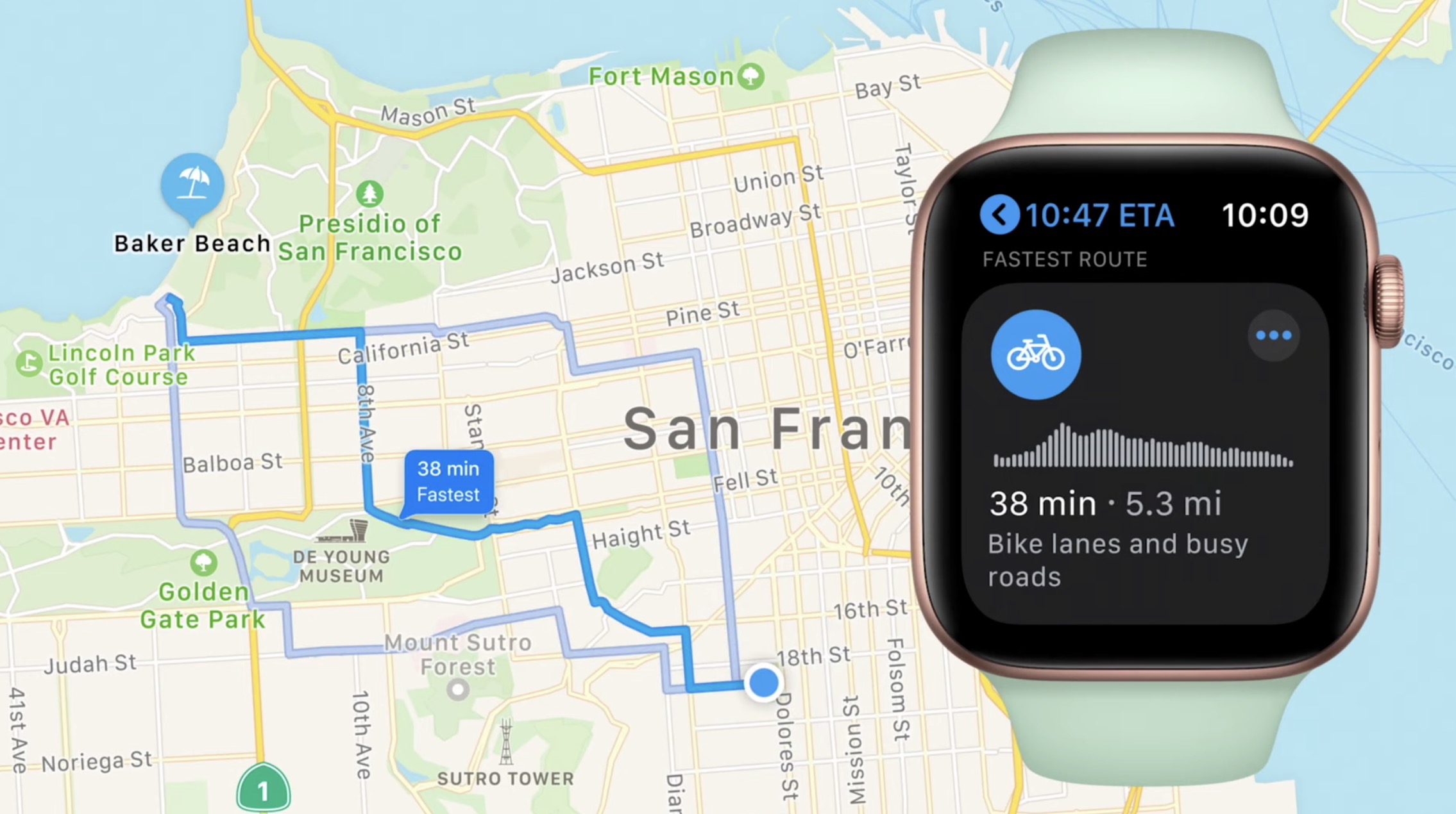 Finalmente, mi nueva característica favorita son las indicaciones en bicicleta. Al principio solo estará disponible en la ciudad de Nueva York, Los Ángeles, San Francisco, Shangai y Beijing. Apple marca todas las casillas correctas, como tener en cuenta las rutas de ciclismo y la elevación. Las indicaciones paso a paso se ven ligeramente diferentes de las indicaciones para conducir con un marco diferente y una vista más vertical.