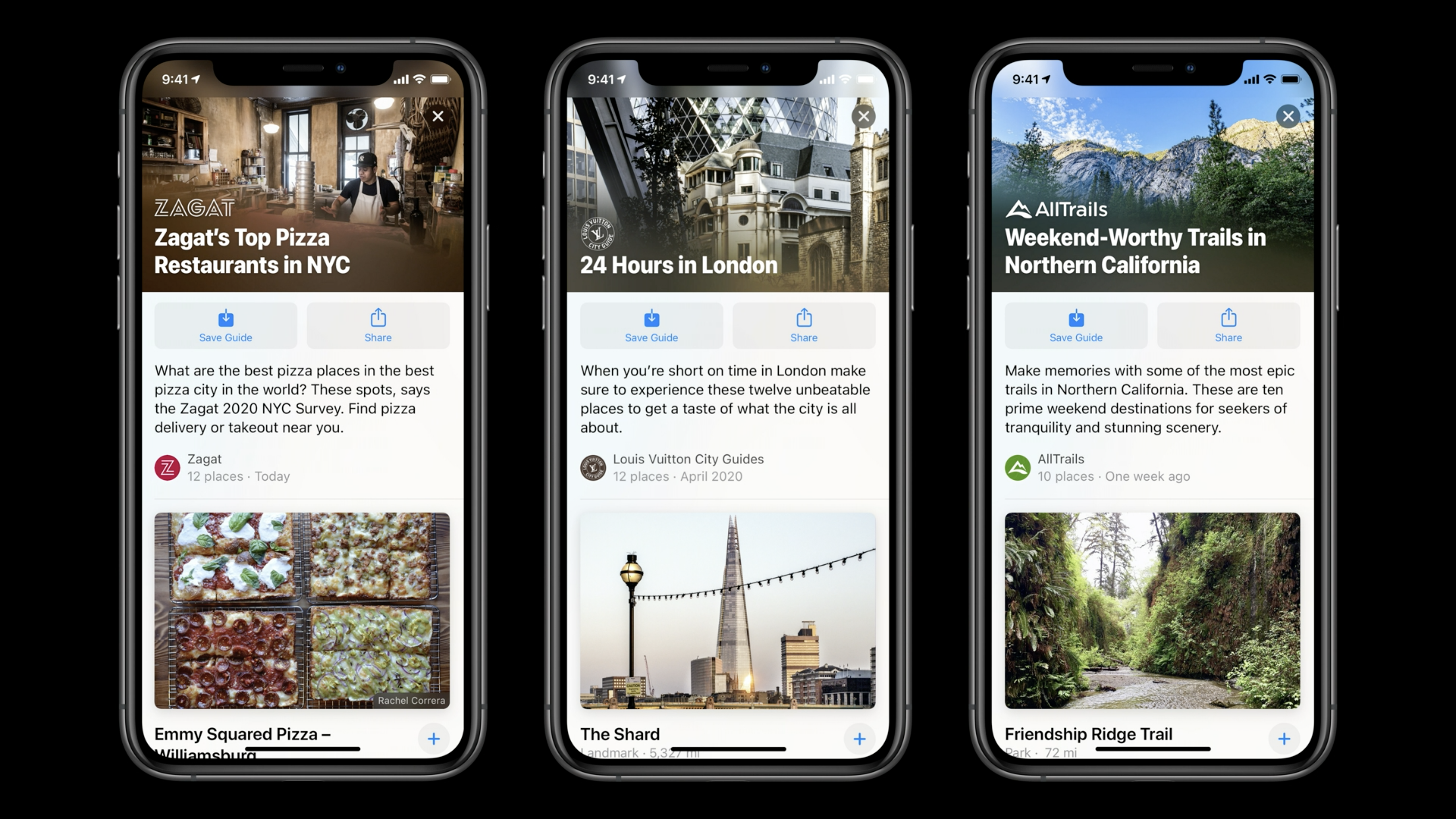Cuando se trata de guías, Apple se ha asociado con AllTrails, Lonely Planet, The Infatuation, Washington Post, Louis Vuitton y otros para agregar listas curadas de lugares a Apple Maps. Cuando toca la barra de búsqueda y se desplaza hacia abajo en la tarjeta de búsqueda, puede ver guías de lugares cercanos.