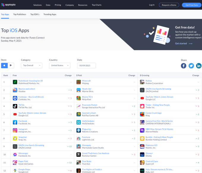 Apptopia también ve un futuro más amplio al hacer que los datos de su aplicación sean más accesibles. El año pasado, por ejemplo, se asoció con Bloomberg para llevar datos móviles a los inversores a través del portal de aplicaciones Bloomberg en la terminal Bloomberg. Y ahora funciona con AWS Data Exchange y Snowflake de Amazon para que el acceso a los datos de la aplicación también esté disponible en otros canales. Las asociaciones futuras de naturaleza similar podrían entrar en juego como otro medio para diferenciar los datos de Apptopia de sus rivales.
