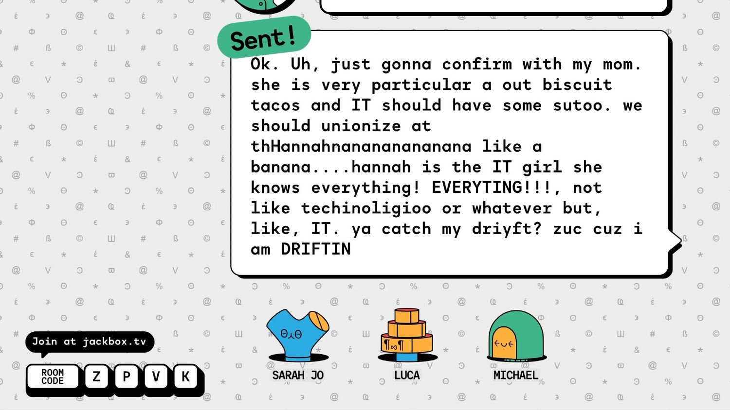 Texto fijo es otro destacado de Paquete de fiesta Jackbox 10, fomentando la escritura con un estilo de flujo de conciencia sin botón de retroceso. El juego gira en torno a varias personas que trabajan para responder un mensaje de texto al mismo tiempo; a veces es para un jefe, otras para un amante o un número equivocado, pero quienquiera que sea tiene preguntas para ti que el anfitrión no quiere responder. Los jugadores comienzan la ronda colocando el cursor en algún lugar dentro de un texto inicial escrito previamente y luego escribiendo lo que quieran, a veces superponiéndose con otros jugadores. Después, los no participantes pueden seleccionar sus palabras favoritas (o, más a menudo, completas tonterías), lo que le otorga puntos al escritor.