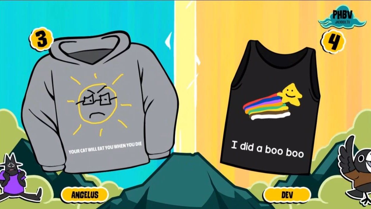El impacto de tener nuevas camisetas y fuentes parece un pequeño ajuste, pero tiene mucho peso: es difícil explicar por qué algunas imágenes son más divertidas cuando están en una camiseta sin mangas o en letras elegantes, pero lo son. Últimos años Paquete de fiesta Jackbox 9 Carecía de un juego de dibujo real, y esta entrada ciertamente lo rectifica. El único pequeño paso en falso es la ronda final donde los competidores tienen que tocar furiosamente la pantalla y llenar un medidor para reclamar la victoria, lo cual parece un poco superficial, pero hay suficientes risas que realmente no importa.