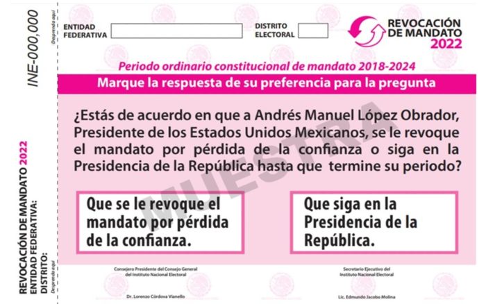 Una comisión del Instituto Nacional Electoral (INE) avaló el diseño y la impresión de la papeleta para la revocación de mandato del presidente Andrés Manuel López Obrador, en caso de que se cumplan todos los requisitos para llevar a cabo el proceso.