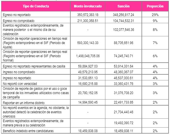 Agregó que durante la revisión contable se advirtieron 60 tipos de irregularidades que cometieron los partidos políticos, coaliciones y candidaturas independientes. En ocho de estas conductas se concentra el 73.10% de las sanciones impuestas, entre las cuales destacan los egresos no reportados.