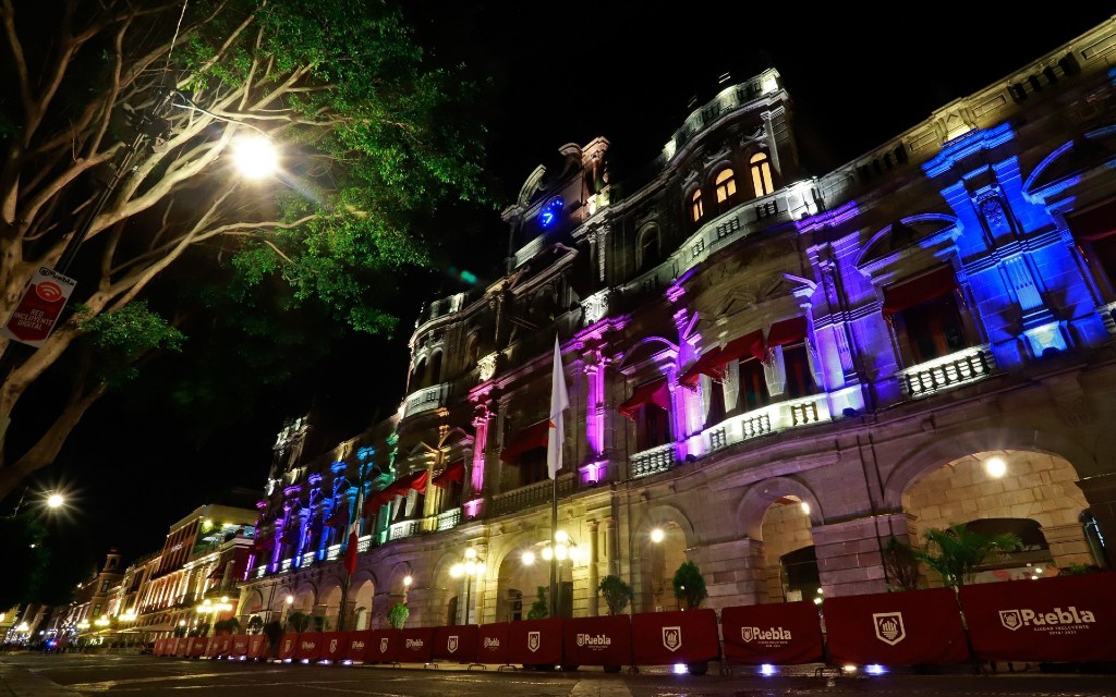 El edificio del Ayuntamiento de Puebla se iluminó con las luces que representan a la comunidad LGBTTTI.