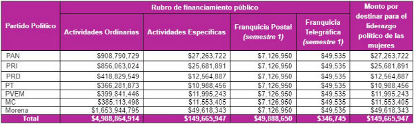 El partido con financiamiento más alto será Morena, con 1,653 millones de pesos, y le sigue el PAN con 908 millones. En contraste, el PT recibirá 366 millones y MC, 385 millones.