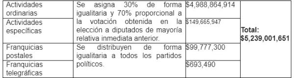 De acuerdo con un comunicado del INE, la Comisión de Prerrogativas y Partidos Políticos del INE aprobó el anteproyecto de acuerdo del Consejo General por el que se distribuyen los montos de financiamiento público que recibirá cada partido político nacional durante el ejercicio 2020, y cuyo monto total asciende a 5 mil 239 millones mil 651 pesos.