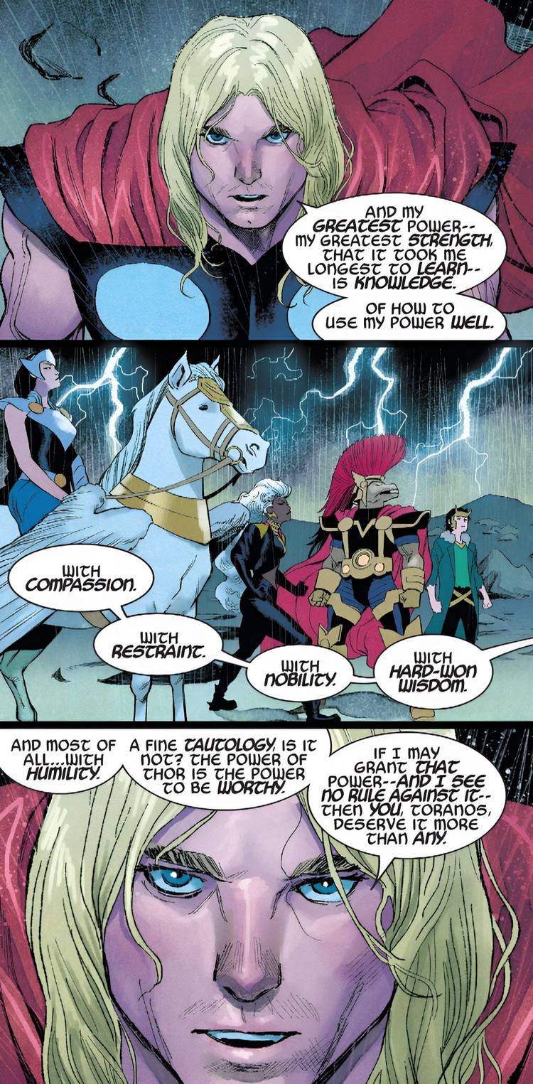 Como rey y guardián de todos los diez reinos, el padre debe ser capaz de entregar una mano fuerte de justicia mientras lo atenúa con un corazón abierto y honesto. En Immortal Thor #5 (2023) –por Al Ewing y Martin Coccolo–Thor establece las cualidades que Mjolnir exige de su portador: Compasión, moderación, nobleza, sabiduría y humildad. Incluso el casi infinito