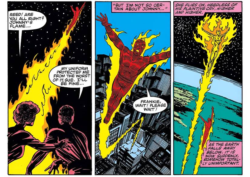 A pesar de la naturaleza tradicionalmente descarada y miope de Johnny, quiero darle crédito al héroe donde se debe el crédito. Su primer gran género hacia el verdadero heroísmo sucedió en Fantastic Four #244 (1982) –por John Byrne, después de su primer gran amor, Frankie Raye, sacrificó su humanidad por