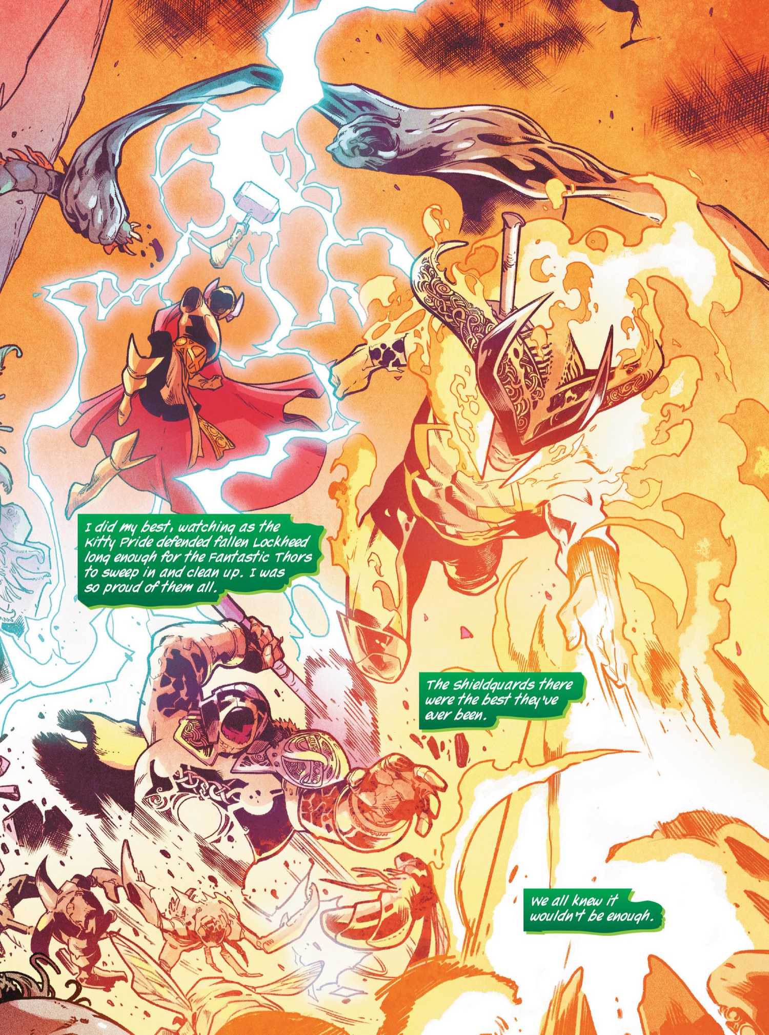 Allá por Siege #4 (2015)–By Kieron Gillen y Filipe Andrade: el Universo Marvel acababa de lanzar su 2015 Guerras secretas Evento, que culminó en un mundo amalgamado forjado de los trituros del multiverso. En este punto, los thors del multiverso se habían reunido y reformado como