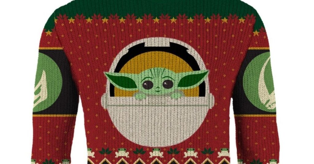 Los entusiastas de los suéteres navideños feos sin duda han estado al borde de su asiento esperando saber qué tenían en mente Disney y Lucasfilm para The Child (también conocido como Baby Yoda) este año. Bueno, finalmente puedes descansar un poco después de haber asegurado el no tan feo Baby Yoda Star Wars: el suéter mandaloriano que se muestra aquí.