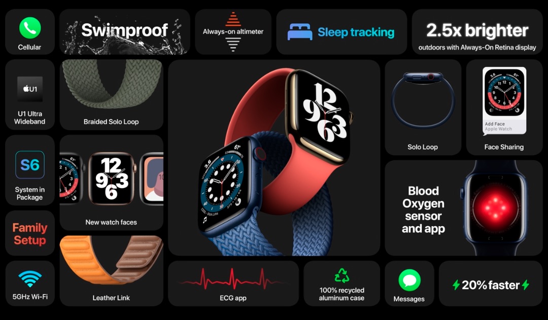 Uno de los grandes anuncios de Apple es el nuevo Apple Watch Series 6, con un precio de 399 dólares. El nuevo dispositivo portátil viene con un nuevo chip de silicio Apple S6 con una pantalla de ahorro de energía siempre encendida. También aterriza con un sensor de oxígeno en sangre.
