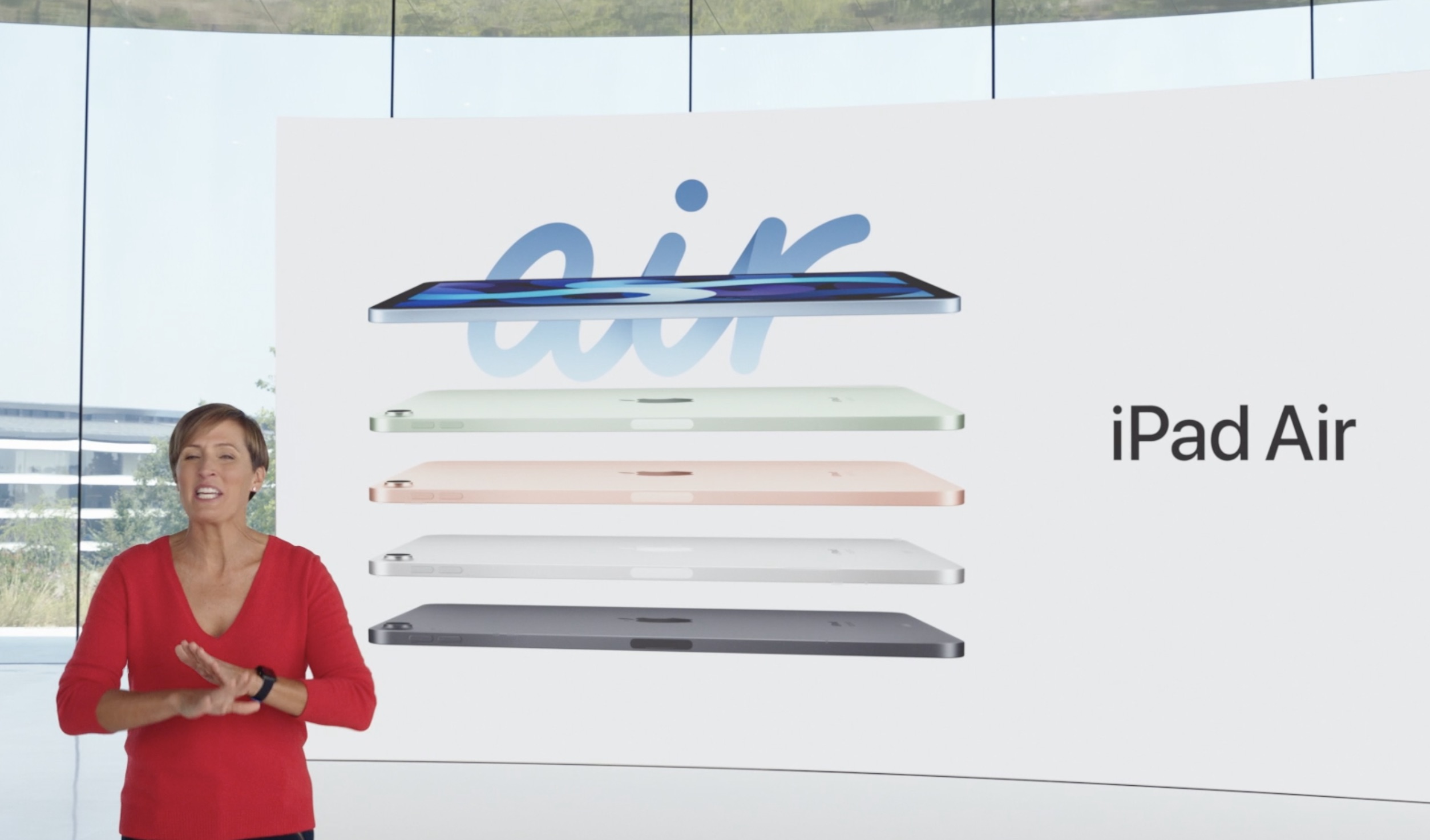 A continuación, el iPad. Apple dijo que está renovando la línea de iPad con un nuevo iPad Air de cuarta generación. El nuevo iPad Air delgado aterriza con una pantalla Retina de 10.9 pulgadas con resolución de 2360 × 1640 y reemplaza el puerto Lightning con un cable USB-C. El nuevo iPad Air viene con un sensor de huellas dactilares Touch ID integrado en el botón de encendido y una nueva cámara trasera de 12 megapíxeles con capacidad para 4K.