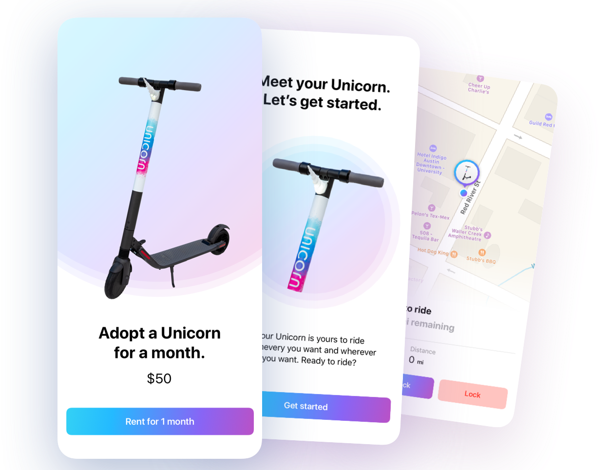 Unicornio: Las compañías de scooters que alquilan por minuto pierden 2% de su flota por día en daños y robos, y eso significa que los clientes no tienen un scooter seguro disponible cuando lo desean. Unicornio alquila scooters por semana o mes y ya es rentable. Los vehículos no se dejan afuera durante la noche y pasan más tiempo alquilados, mientras que los clientes saben que hay un scooter disponible para ellos sin tener que comprar uno directamente. El fundador de Unicorn comenzó Tile y ahora quiere construir un negocio de economía de unidades mejor que Lime y Bird.