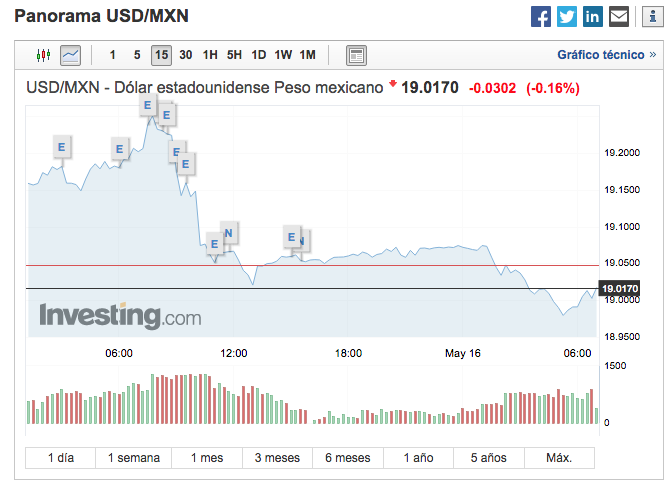 Este jueves 16 de mayo, el dólar interbancario se ubica en 19.01 pesos.