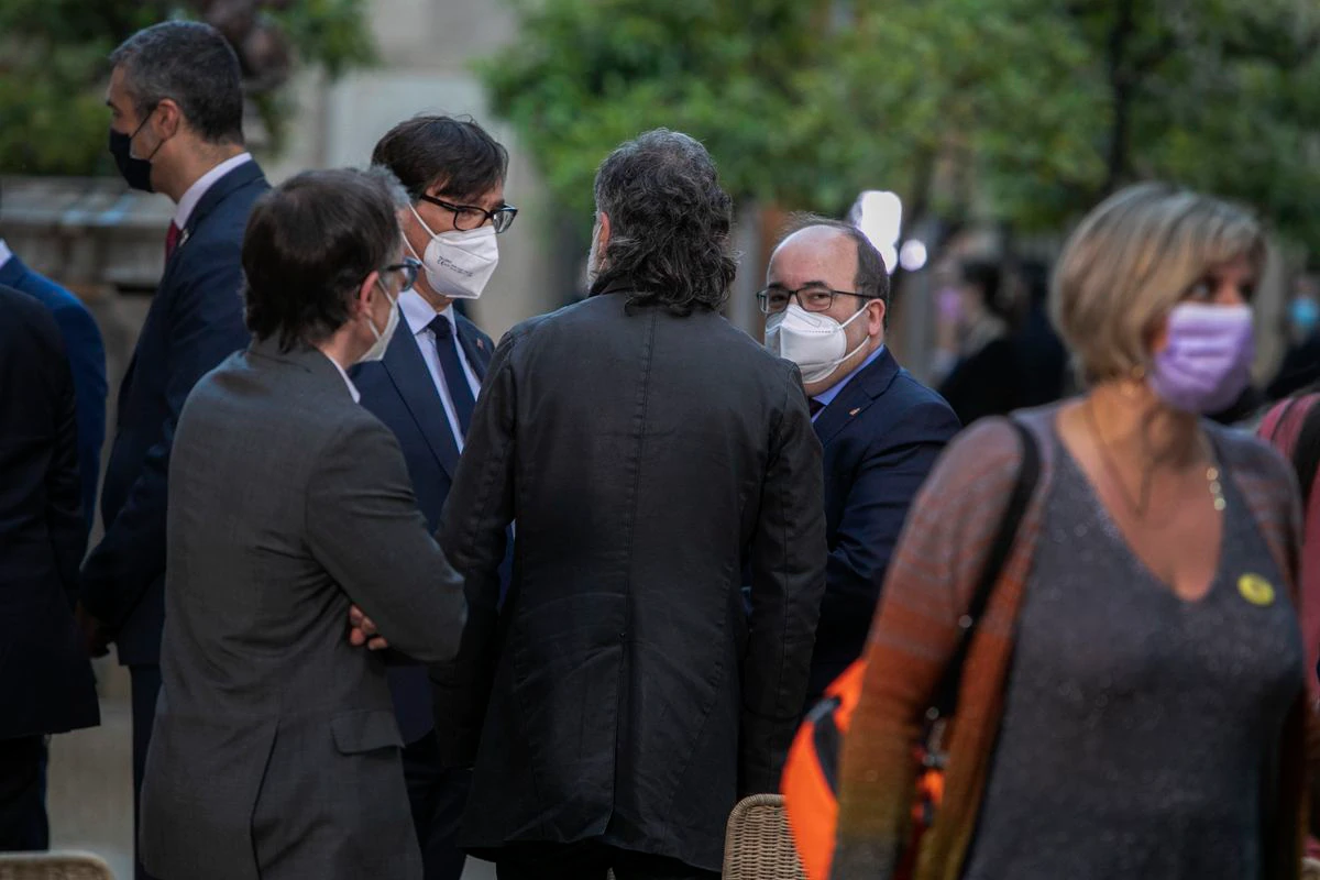 En el Pati dels Tarongers, esperaban 40 personas, entre ellas el actual Govern; Junqueras; Cuixart, y Jordi Sànchez, secretario general de Junts, los tres de permiso penitenciario; Iceta; Salvador Illa, líder del PSC, o la alcaldesa de Barcelona, Ada Colau. Laura Borràs, presidente del Parlament, ha leído el decreto de investidura y, posteriormente, el expresident Torra le ha brindado la medalla de la Generalitat que ha dado pie a la lectura de su discurso. Iceta ha estado hablando un rato con los presos.