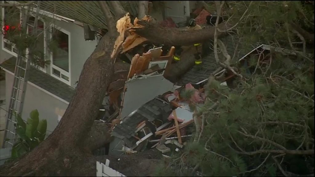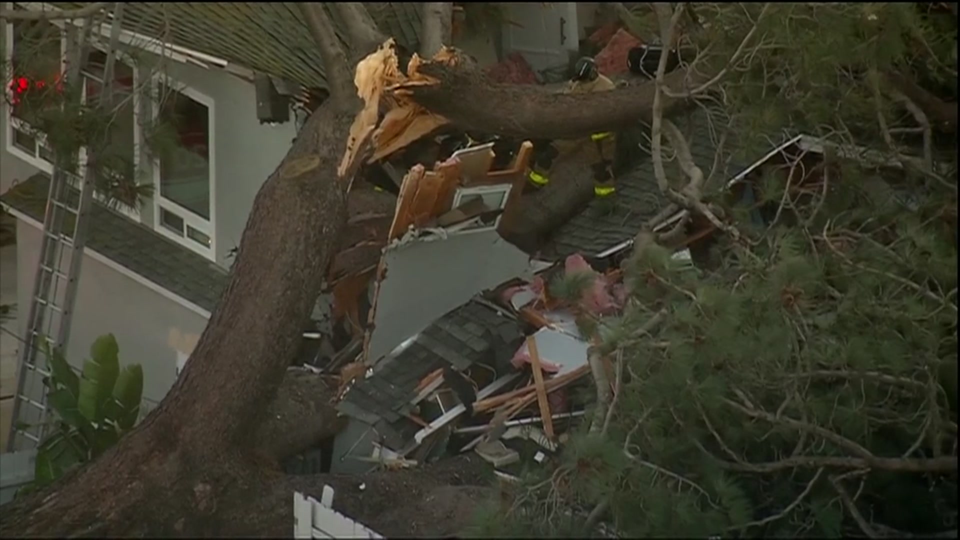El árbol se desplomó sobre la casa ubicada en la intersección de la avenida Santa Mónica y la calle Santa Bárbara, dijo el Departamento de Policía de San Diego.
