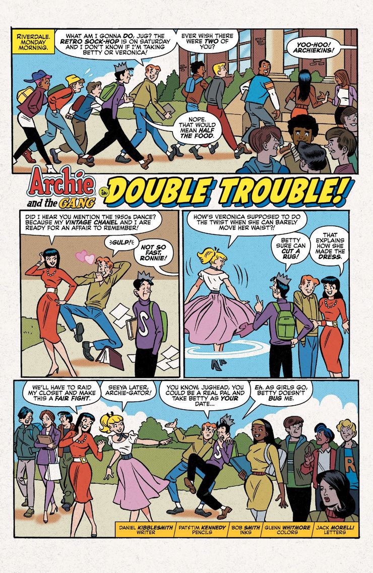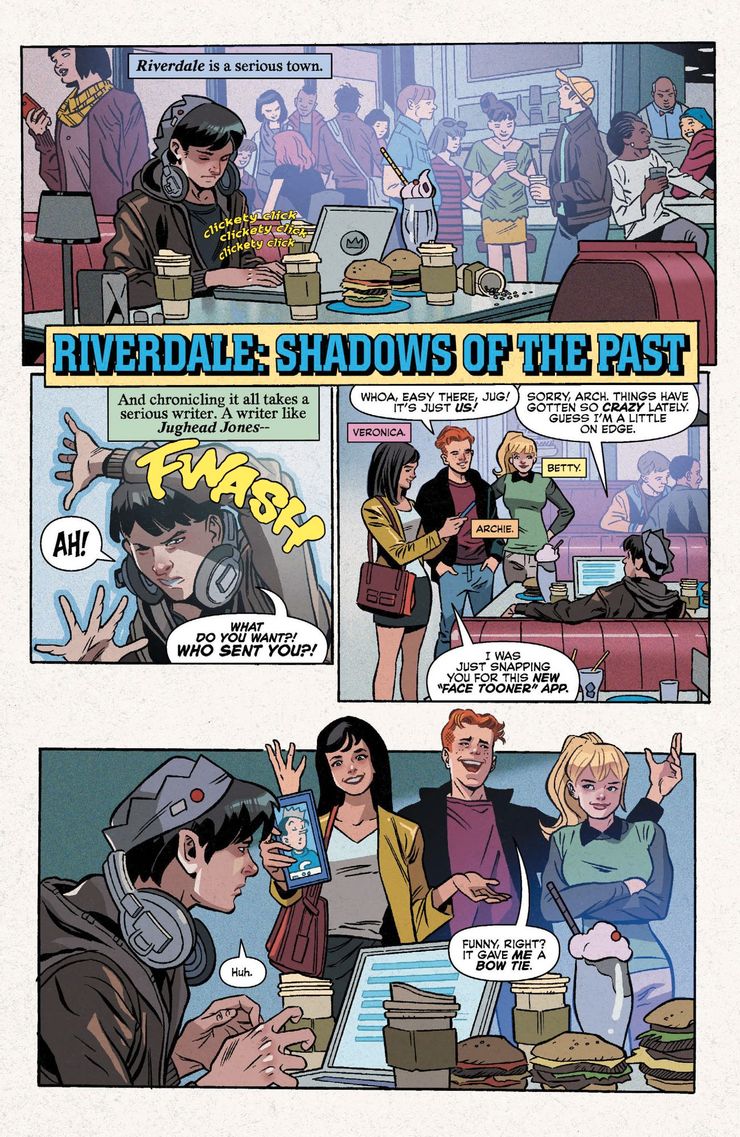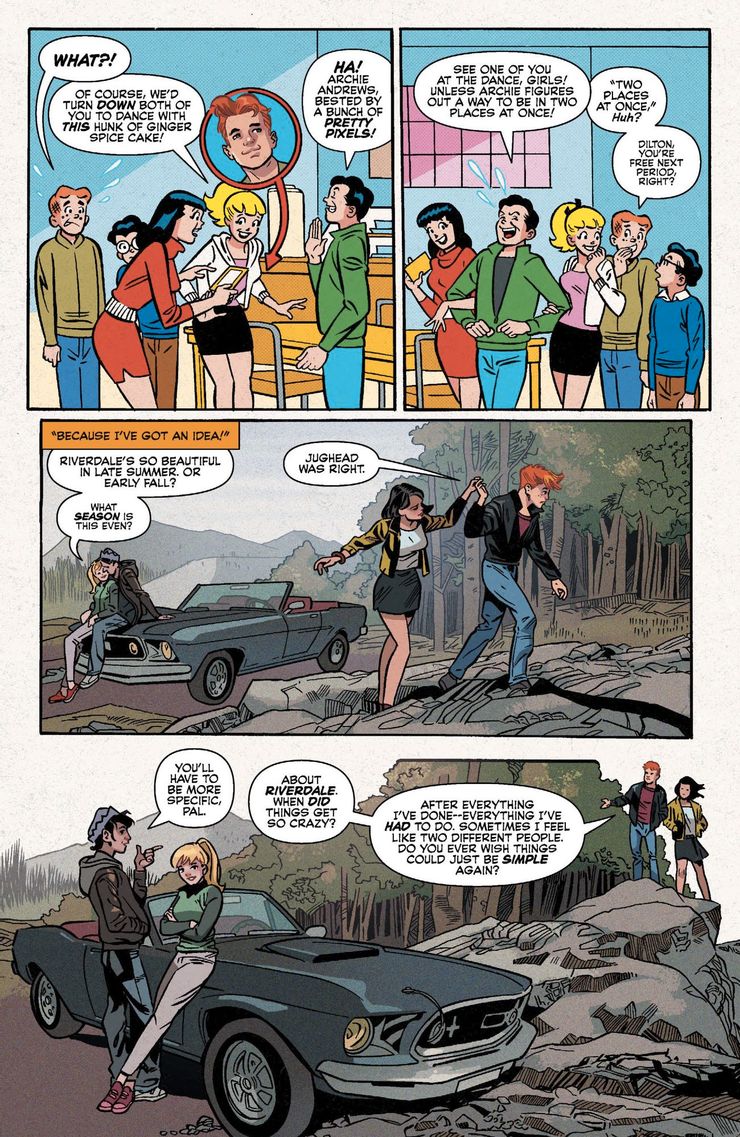 DK: Es curioso que lo preguntes: una de las razones por las que cortamos ese complicado dispositivo de encuadre que mencioné es porque era lo suficientemente grande como para ser su propia historia, si alguna vez tuviera la oportunidad de hacer una secuela. No revelaré los detalles aquí, pero mi personaje favorito de Archie-verse, tanto en los cómics como en Riverdale, apenas aparece en este one-shot, a pesar de ser un gran miembro del reparto en ambos universos. Si hiciéramos una secuela, definitivamente se centraría en esa persona. Me encantaría verlos conocer a su doble. O, en este caso, cuádruple.