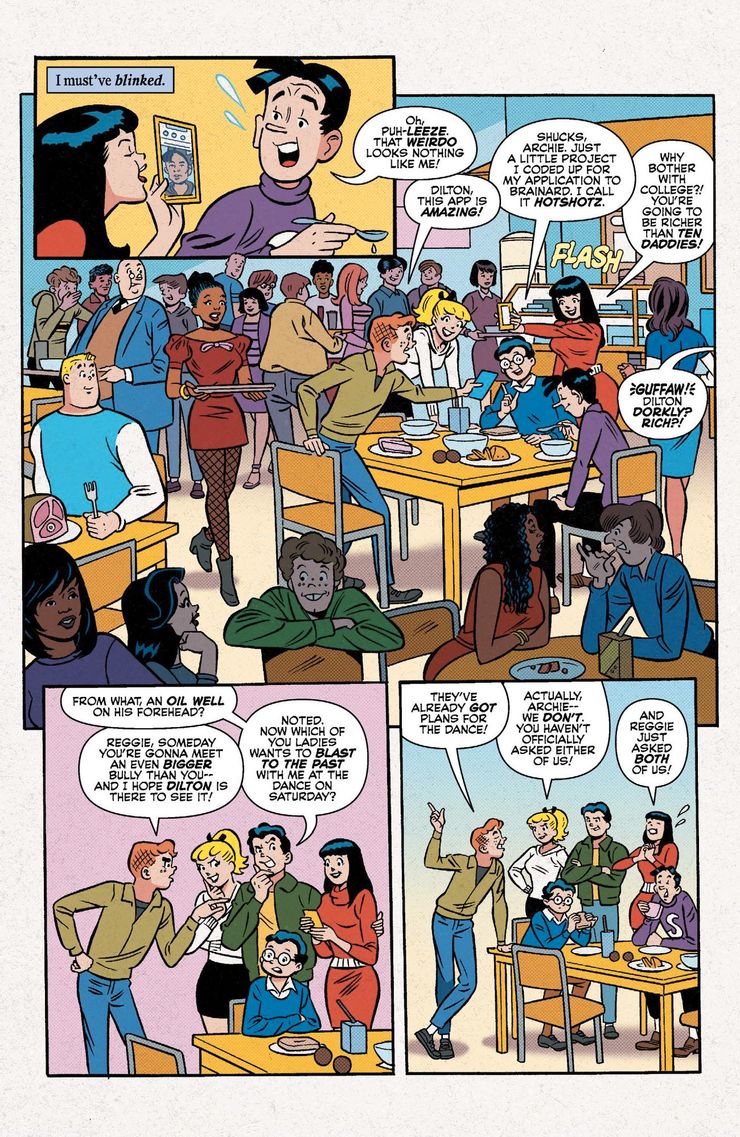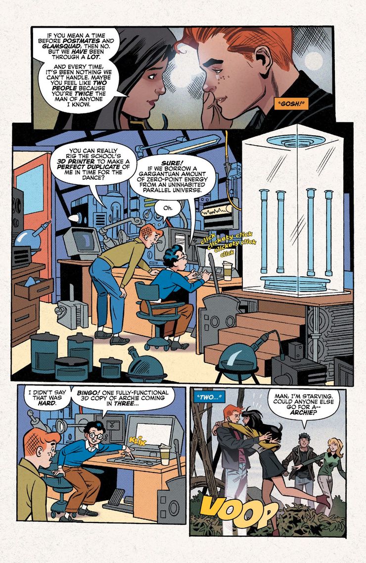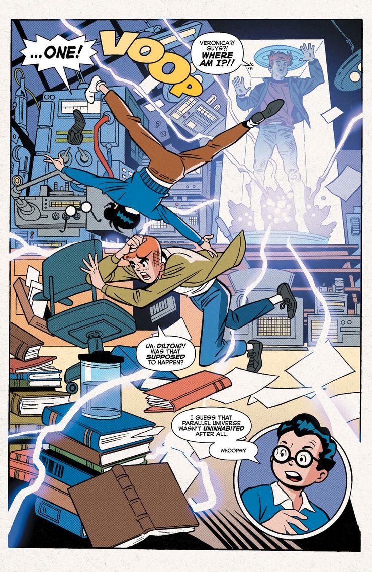 DK: Oh, eso es fácil, simplemente no eliminé ninguna referencia. Cada broma, cada huevo de pascua, cada servicio de fanático que quería hacer está en este cómic. Una referencia clásica de Archie ni siquiera se me ocurrió hasta que estaba a unos minutos de entregar el guión final y terminó siendo, no solo un poco de servicio a los fanáticos, sino una parte crucial de exposición, y ahora uno de mis momentos favoritos en la historia completa. Mi sensación fue que esta podría ser la única vez que estos universos chocan (y la única vez que puedo escribirlos), así que será mejor que intentemos hacer TODO lo que los fans quieren ver.
