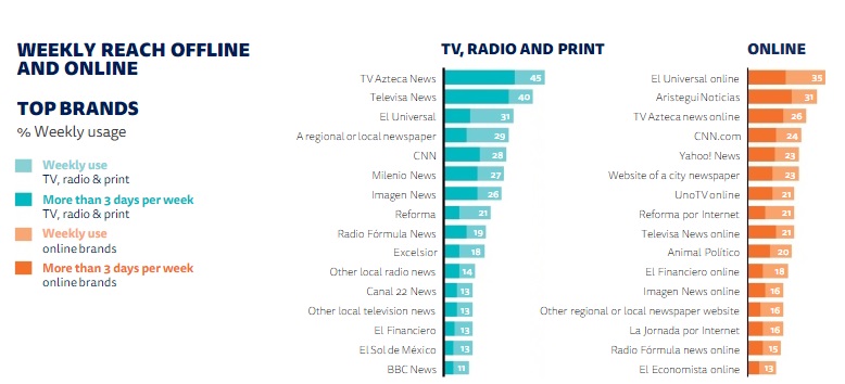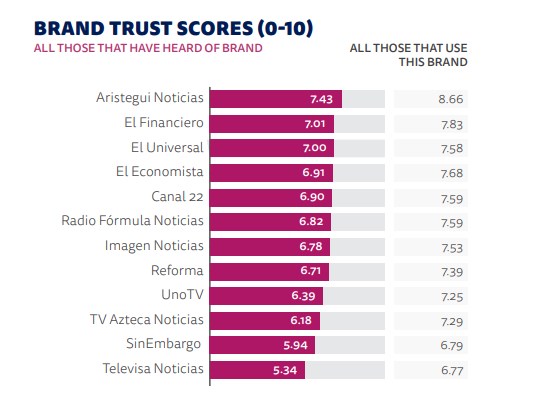 “Los medios tradicionalmente han gozado de altos niveles de confianza en México, junto con instituciones religiosas y universidades. La televisión es el medio más popular entre audiencias y anunciantes, pero de forma inusual en esta encuesta marcas de periódicos y algunas marcas nativas digitales obtienen mejores calificaciones en cuanto a confianza”, afirmó el Instituto Reuters en su reporte 2019.