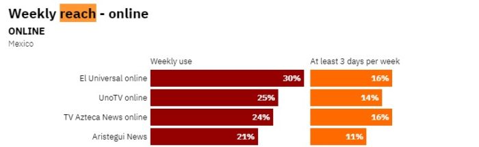 En alcance online, por ejemplo, este sitio se encuentra sólo por debajo de la web de El Universal, Uno TV y Tv Azteca, como se puede apreciar en la siguiente tabla: