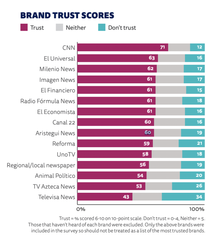 Al discurso presidencial se le une la propagación de información falsa y engañosa como posible explicación para la reducción en la confianza en los medios. Según una encuesta de Reuters, “el 69% dijo que había visto informaciones falsas o engañosas sobre el Coronavirus, y el 52% la presenció sobre política la semana anterior”. Ambas figuras son considerablemente más altas que el promedio de todos los mercados.
