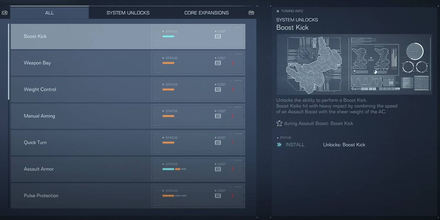El Ajuste del sistema operativo sección de las bodegas del Garaje el sistema se desbloquea y expansiones centrales que actúan como mejoras que puedes equipar a tu mech en Núcleo blindado 6. Para recibir cualquiera de estas piezas, tienes que gastar Chips de sistema operativo, una moneda separada de la moneda COAM estándar. Las fichas son recompensadas en el modo Arenadonde desafías a los Armored Cores enemigos en batallas 1 contra 1, similar al modo PvP.