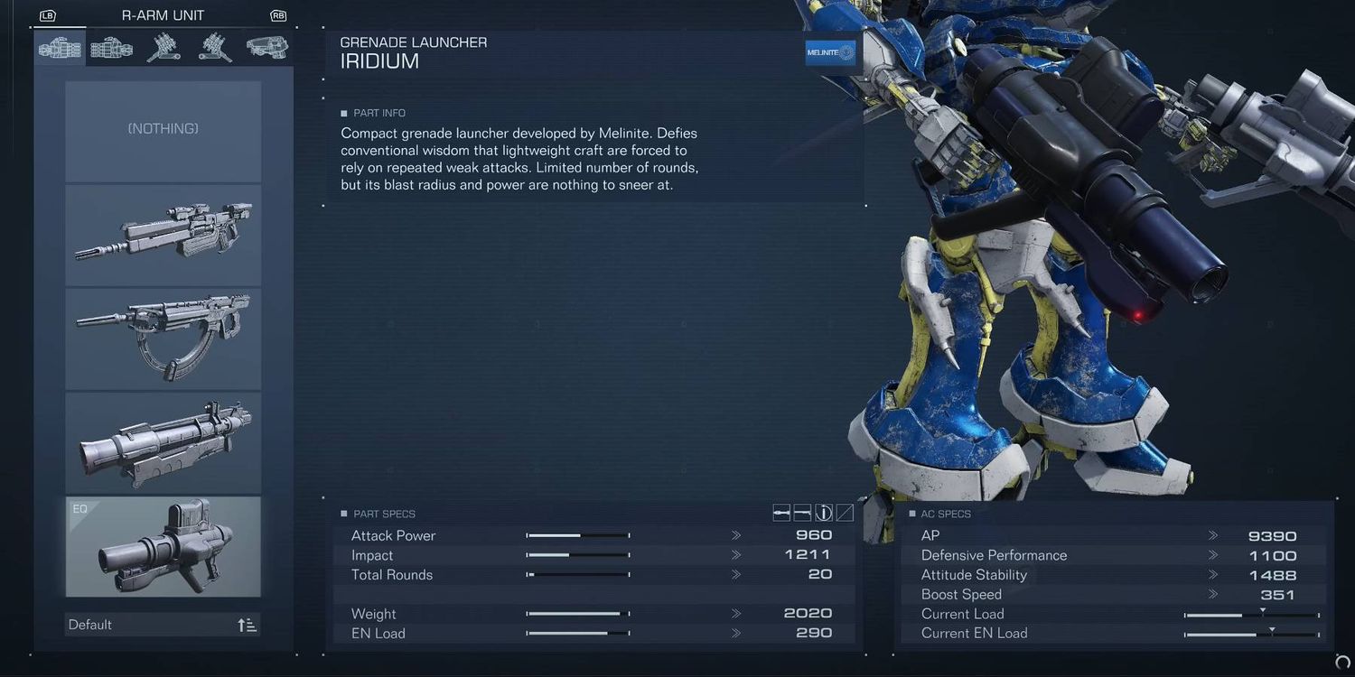 El Lanzador de Misiles dispara cuatro cohetes que pueden apuntar a múltiples enemigos, lo que lo convierte en un arma excelente para las primeras misiones en las que debes enfrentarte a muchos objetivos simultáneamente. Mientras tanto, empuñar una o más bazucas puede ser fantástico para las peleas contra jefes en Núcleo blindado 6 ya que esa arma causa un daño de impacto devastador que podría causar un tambaleo. Del mismo modo, el lanzagranadas también causa un alto impacto pero con una velocidad de disparo más rápida a distancias más cortas.
